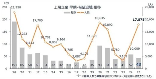 調査によると、2025年に早期・希望退職募集が確認できた上場企業は43社。募集人数は合計1万7,875人となり、東日本大震災時の2012年(1万7,705人)を上回った。これは2009年以降で3番目に多い水準です。